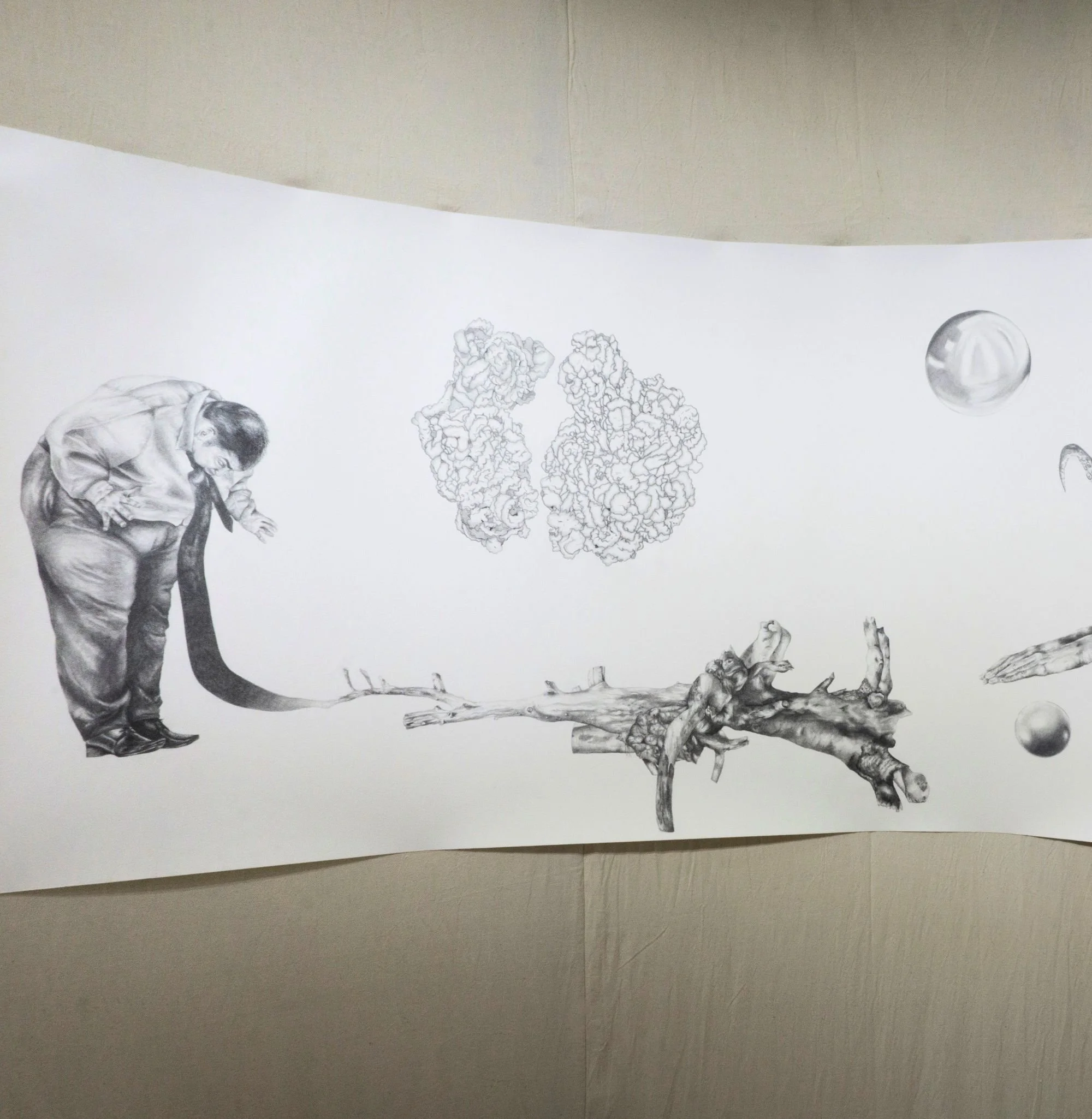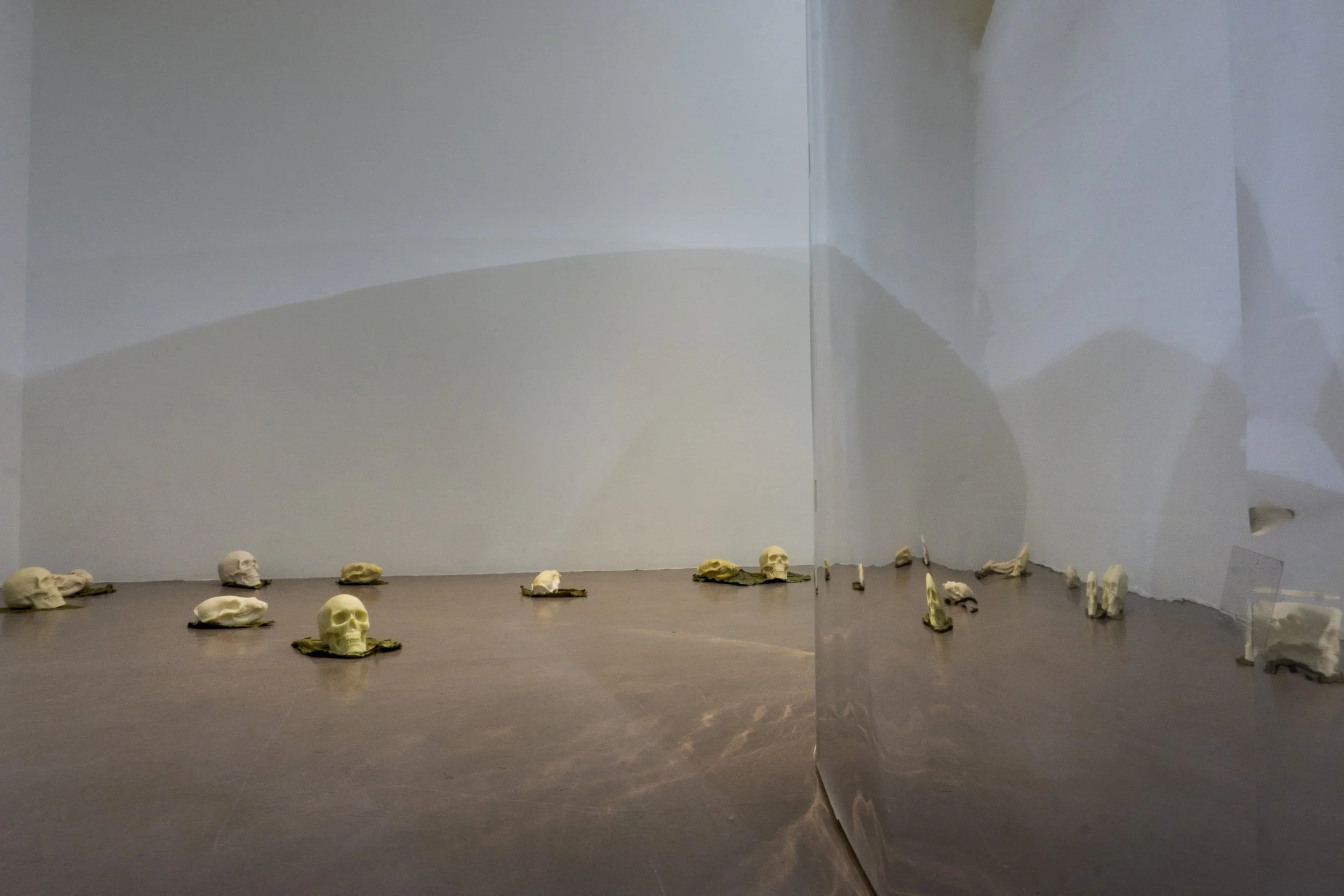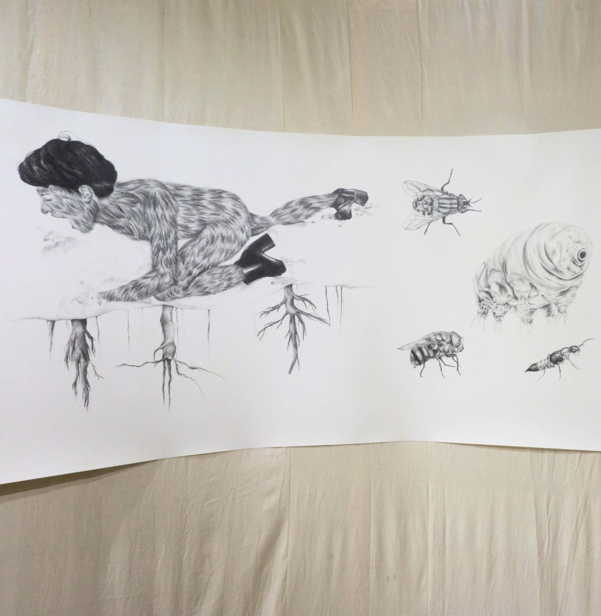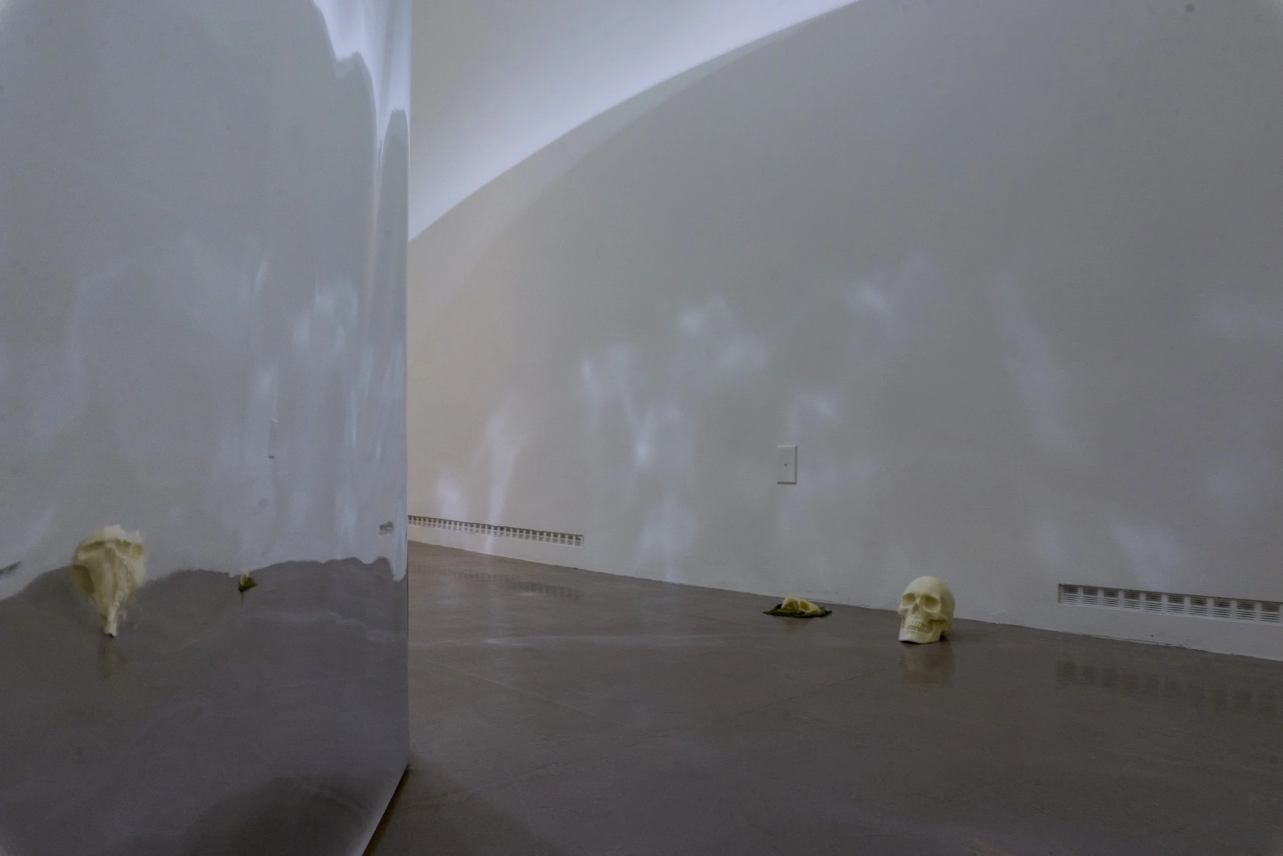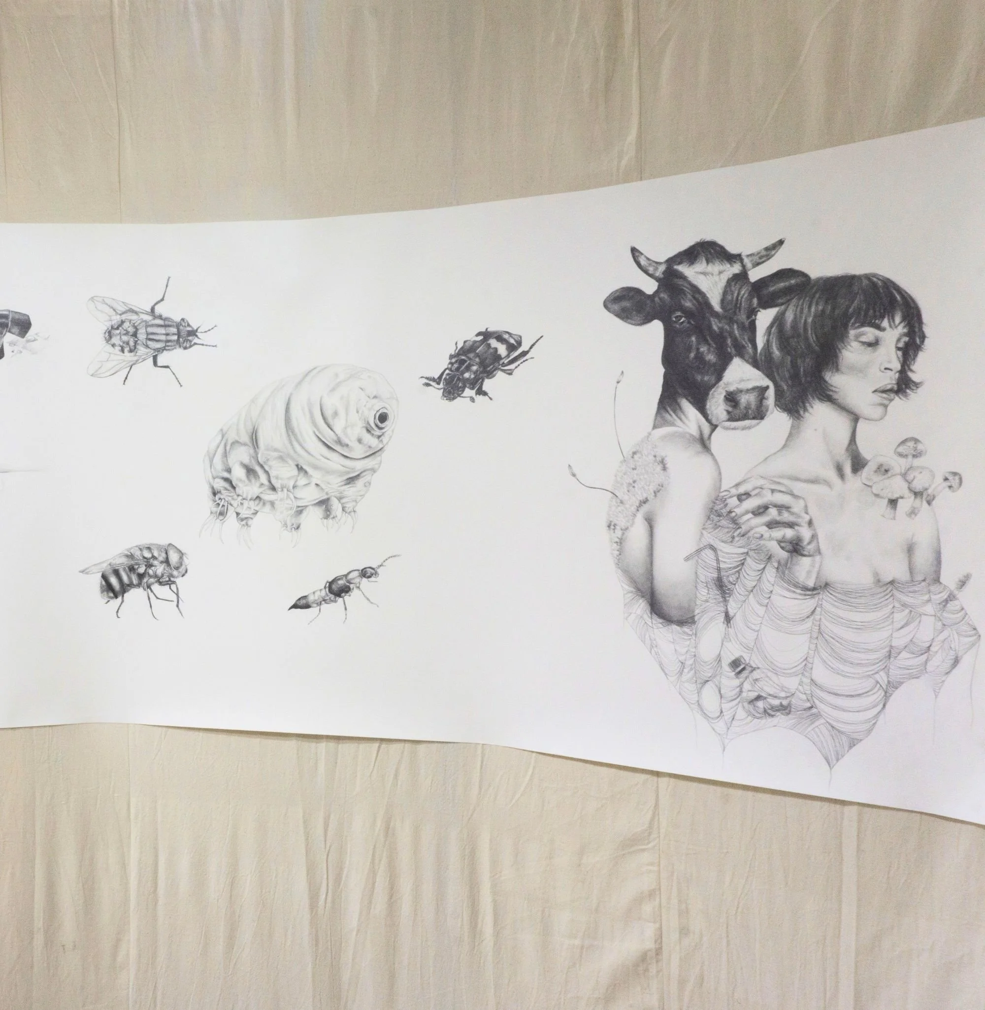 Developed during my doctoral research, Chthulucene Dream-Land: States of Reality is an immersive installation that includes a thirty-foot drawing informed by Donna Haraway’s concept of the Chthulucene. Here, the Chthulucene is explored as a way of thinking beyond anthropocentrism to emphasize multispecies entanglement, composting, and “making-with” in damaged worlds. Fastened to a rounded, floating wall, the work is displayed in a way to heighten presence as viewers move alongside a sequence of interlinked image segments: hybrid figures, absurd vignettes, and unsettling transformations that touch on environmental remediation and destruction, capitalism, colonialism, consumerism, plasticity, privilege, and ongoingness. Surrounding the installation, wax skull sculptures of human, bear, and beaver rest on decaying rhubarb leaves harvested from my mother’s garden, reinforcing themes of impermanence, decomposition, and reworlding. Reflective Mylar on the exterior of the structure subtly distorts the gallery and the viewer’s reflection, inviting a perspective shift and an expanded sense of entanglement within more-than-human ecologies.