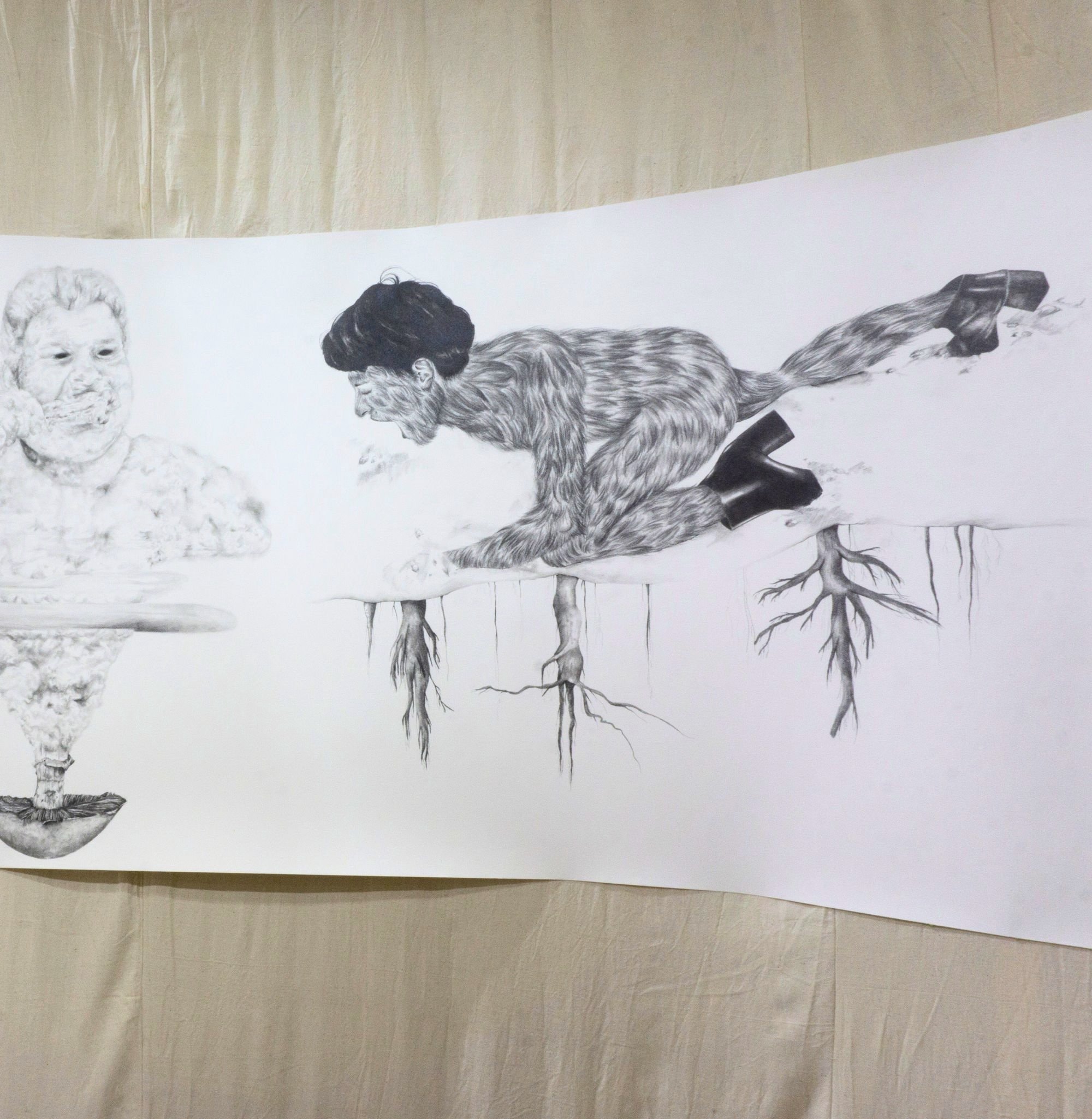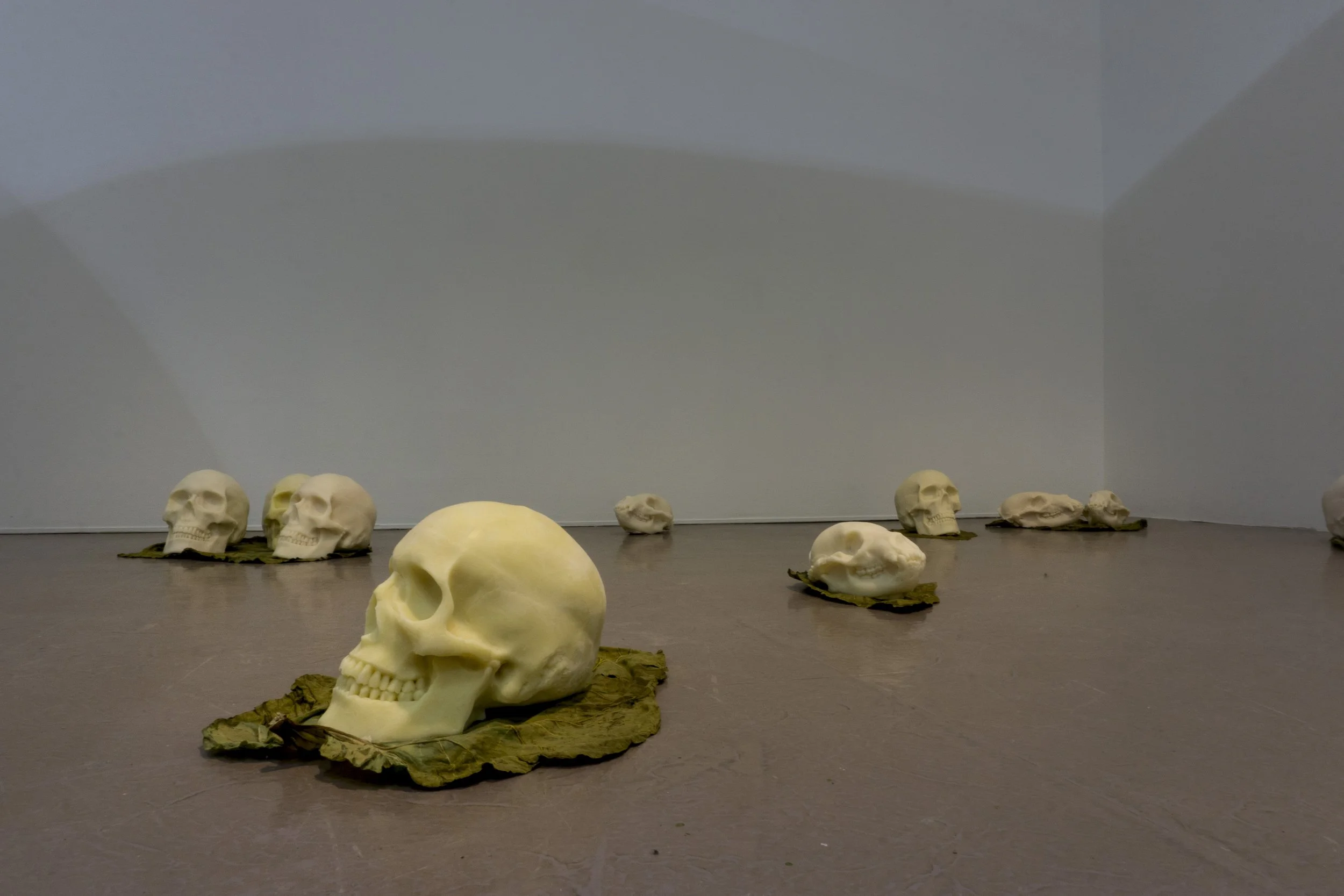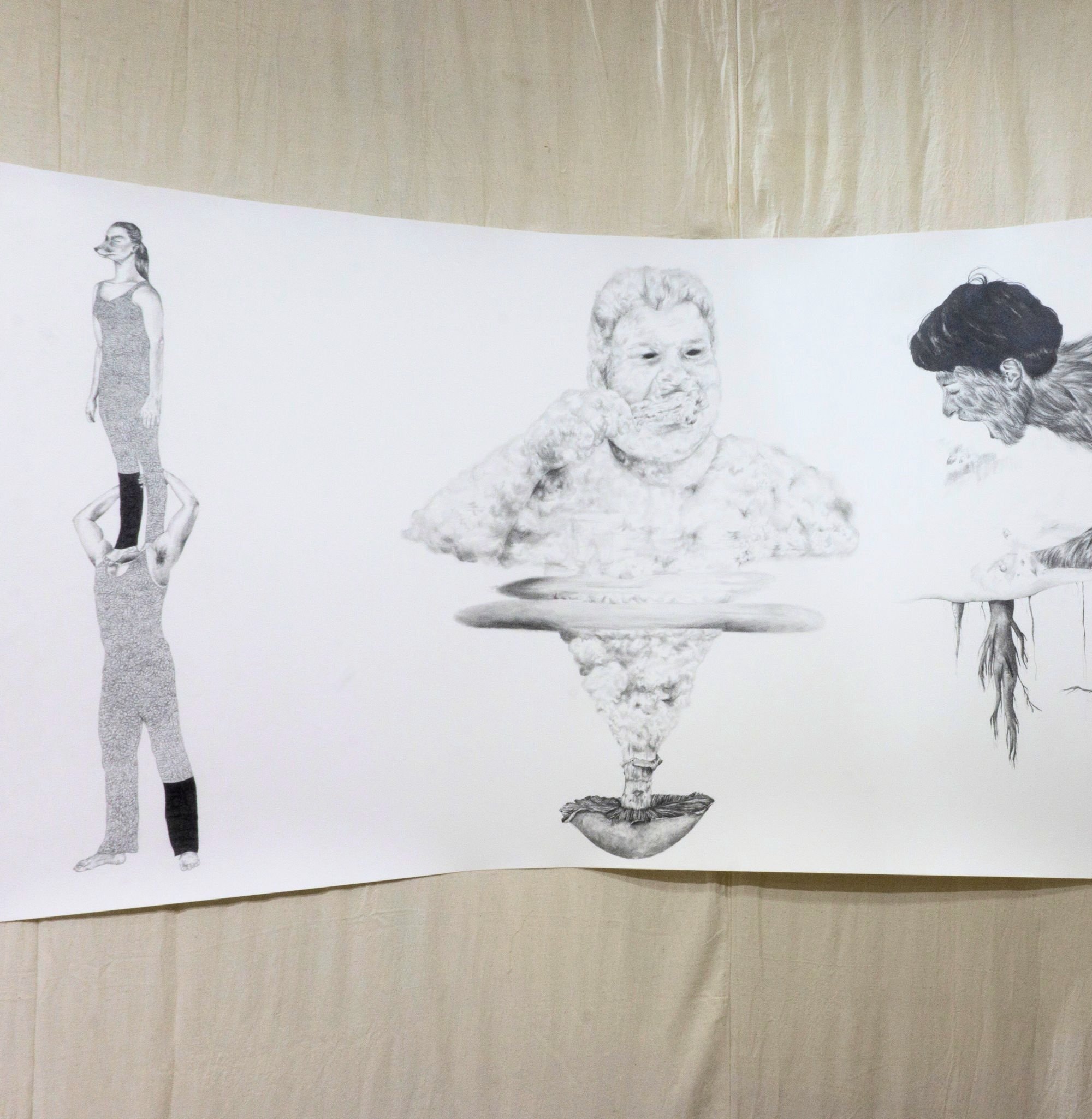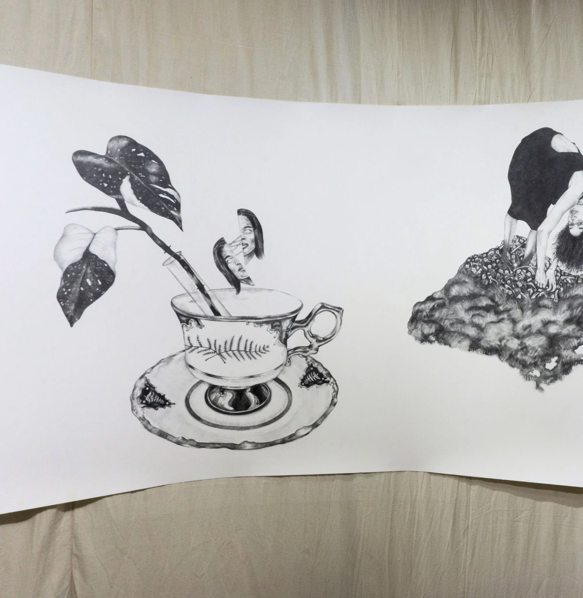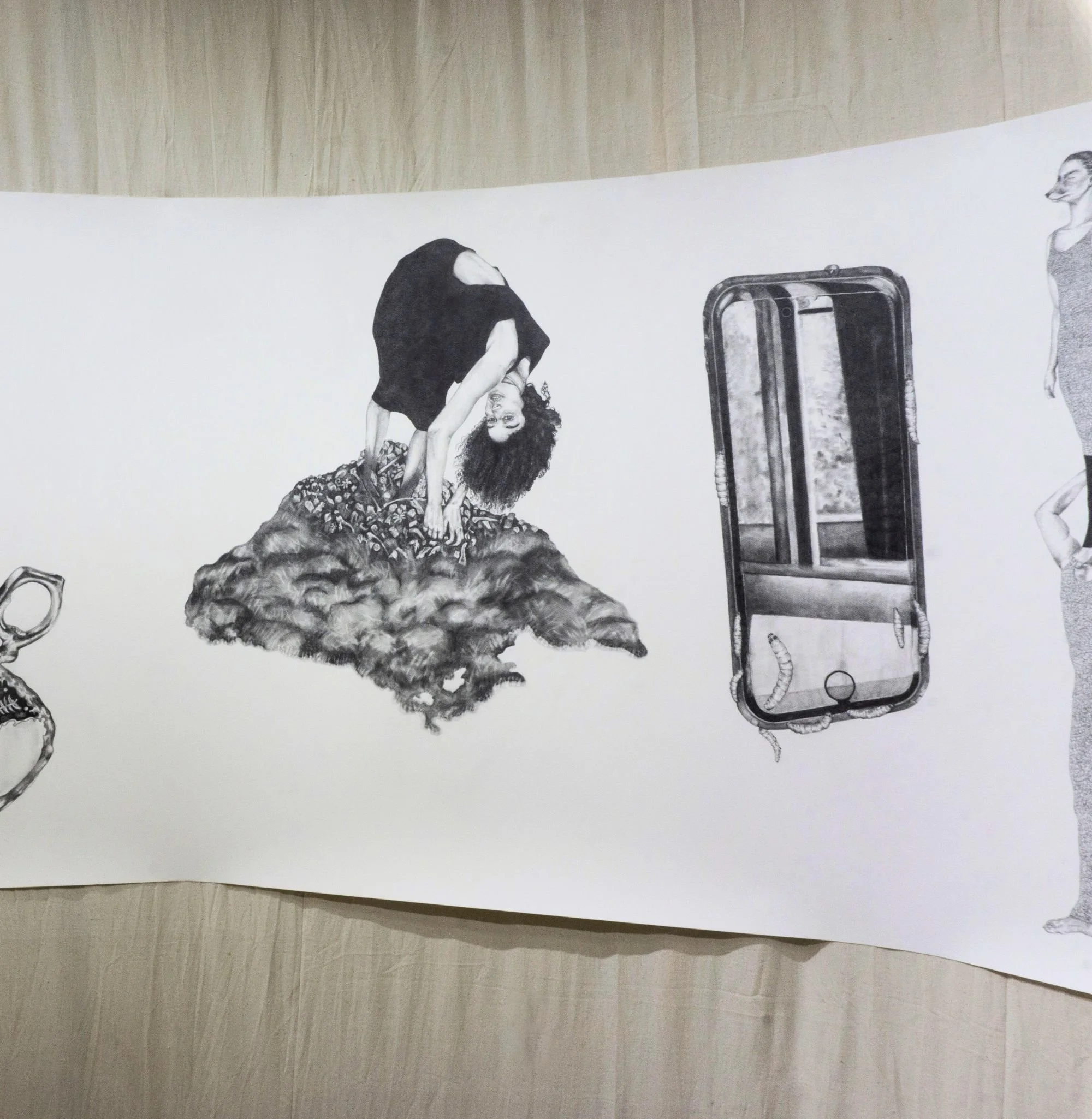 Developed during my doctoral research, Chthulucene Dream-Land: States of Reality is an immersive installation that includes a thirty-foot drawing informed by Donna Haraway’s concept of the Chthulucene. Here, the Chthulucene is explored as a way of thinking beyond anthropocentrism to emphasize multispecies entanglement, composting, and “making-with” in damaged worlds. Fastened to a rounded, floating wall, the work is displayed in a way to heighten presence as viewers move alongside a sequence of interlinked image segments: hybrid figures, absurd vignettes, and unsettling transformations that touch on environmental remediation and destruction, capitalism, colonialism, consumerism, plasticity, privilege, and ongoingness. Surrounding the installation, wax skull sculptures of human, bear, and beaver rest on decaying rhubarb leaves harvested from my mother’s garden, reinforcing themes of impermanence, decomposition, and reworlding. Reflective Mylar on the exterior of the structure subtly distorts the gallery and the viewer’s reflection, inviting a perspective shift and an expanded sense of entanglement within more-than-human ecologies.