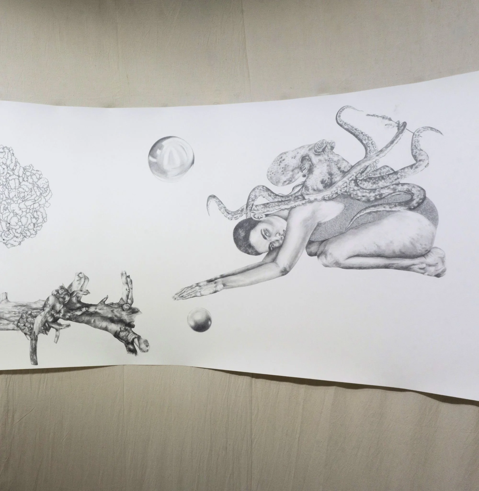 Chthulucene Dream-Land: States of RealityGraphite drawing (360” X 48”), canvas, wood, sand, reflective Mylar, rhubarb leaves, wax